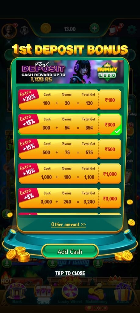 - Select an Amount:The app will display various chip packages (e.g., ₹100, ₹500, ₹1000). Many of these apps offer a first-time deposit bonus or extra percentages for larger amounts. Select the pack you want.